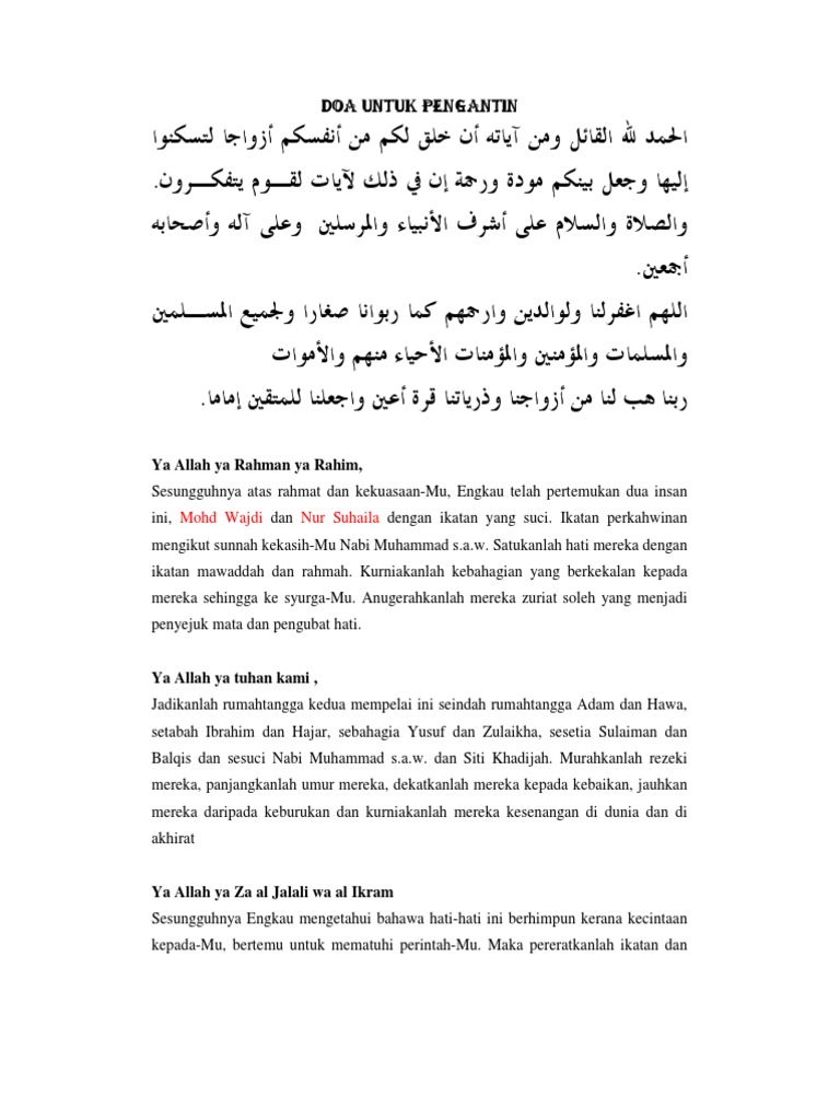 Apa Apa Sahaja Doa Untuk Pasangan Pengantin June 16th 2019 - terjemahan bacaan doa arab dalam tulisan rumi dibuat oleh panglima untuk memudahkan pembaca doa yang kurang arif. Ini adalah doa selamat yang boleh. Barakallahu lakum wa baraka.